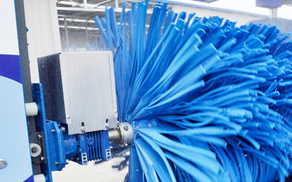 進口意大利塑玻絲輪刷,根據光電開關感應判斷車身位置,輪刷啟動至輪轂位置,開始清洗,正反旋轉刷洗輪轂,電腦洗車機全程電腦全自動控制輪刷伸縮。